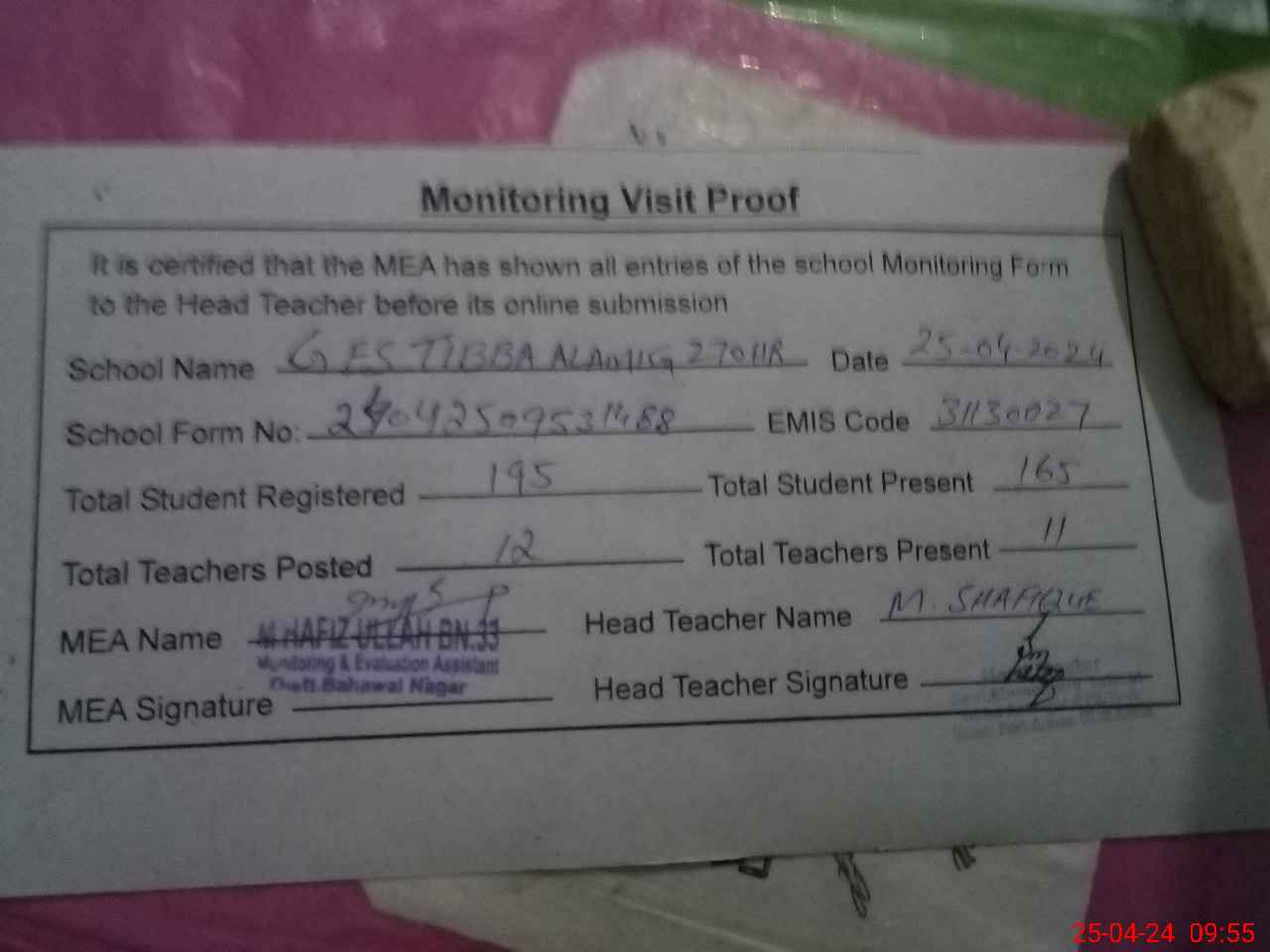 | Attendance Register | Head Teacher | MEA with School | Visit Proof |