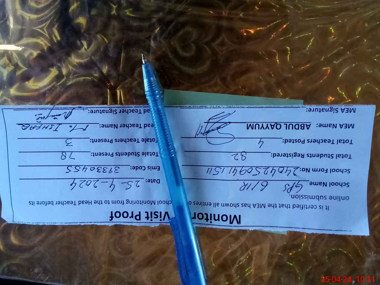 | Attendance Register | Head Teacher | MEA with School | Visit Proof |