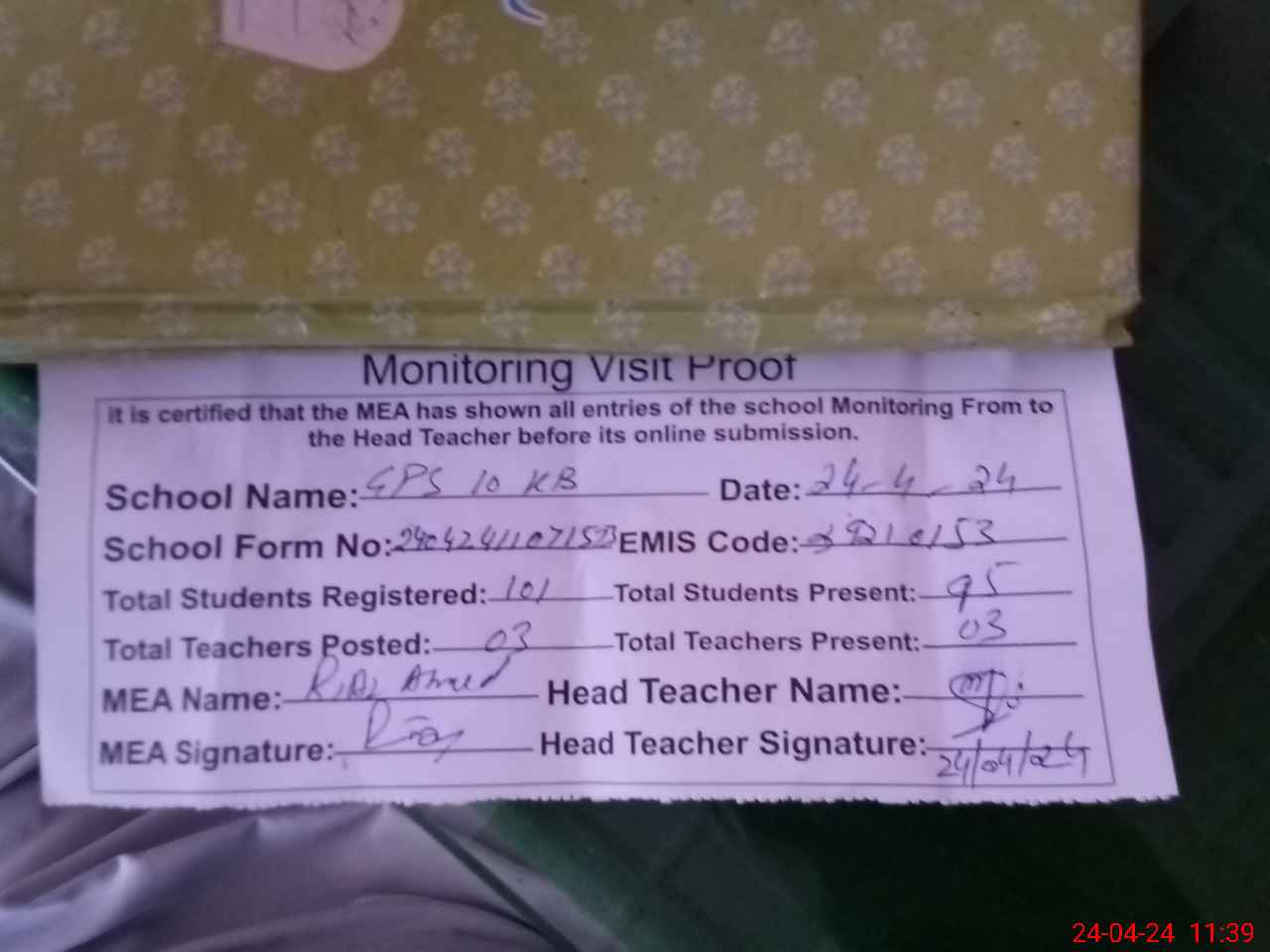 | Attendance Register | Head Teacher | MEA with School | Visit Proof |
