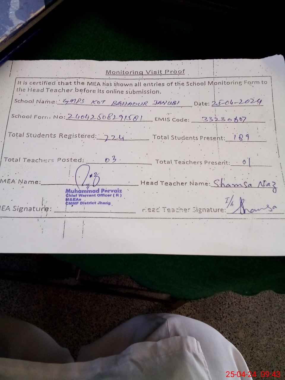 | Name: AS**** ZA**** Designation: (School Headmaster's/Headmistress's) PST Phone/Cell Number: 03**** |