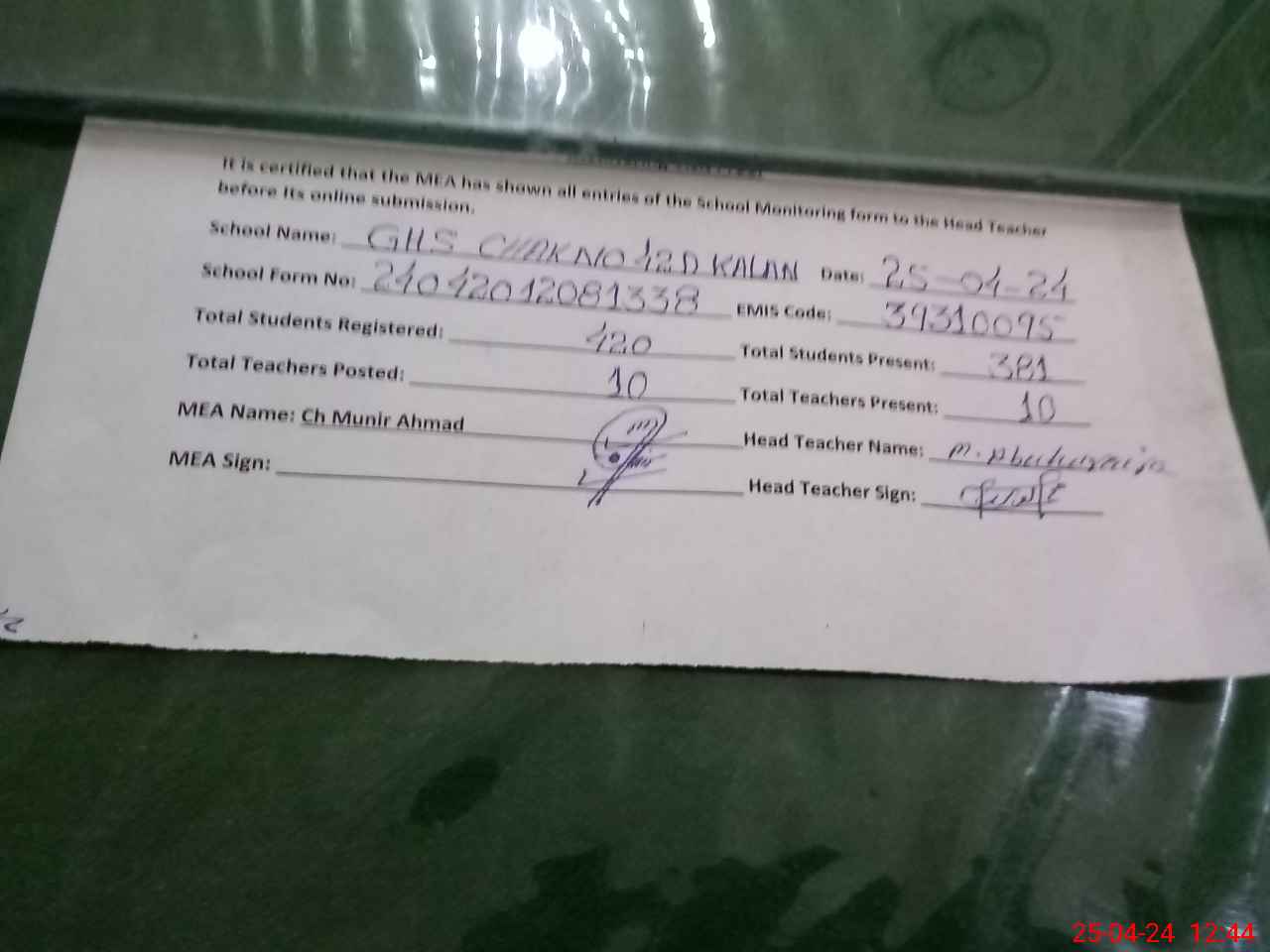 | Certified that this School was Inspected by the Undersigned MEA/DMO Today and the Information Stated Above is as Per Record. | |||||