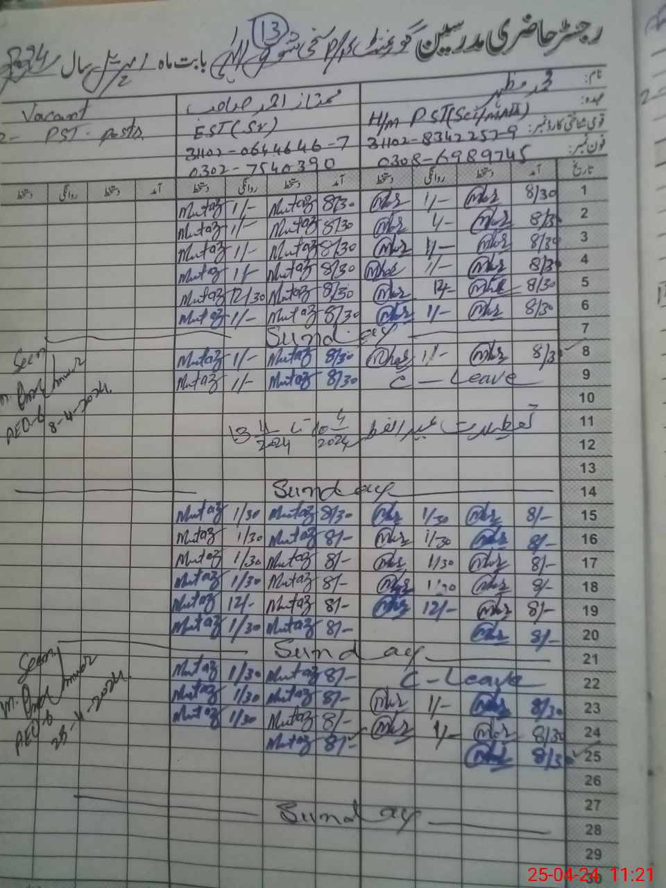 | Name: MU**** Ma**** Designation: (School Headmaster's/Headmistress's) PST Phone/Cell Number: 03**** |