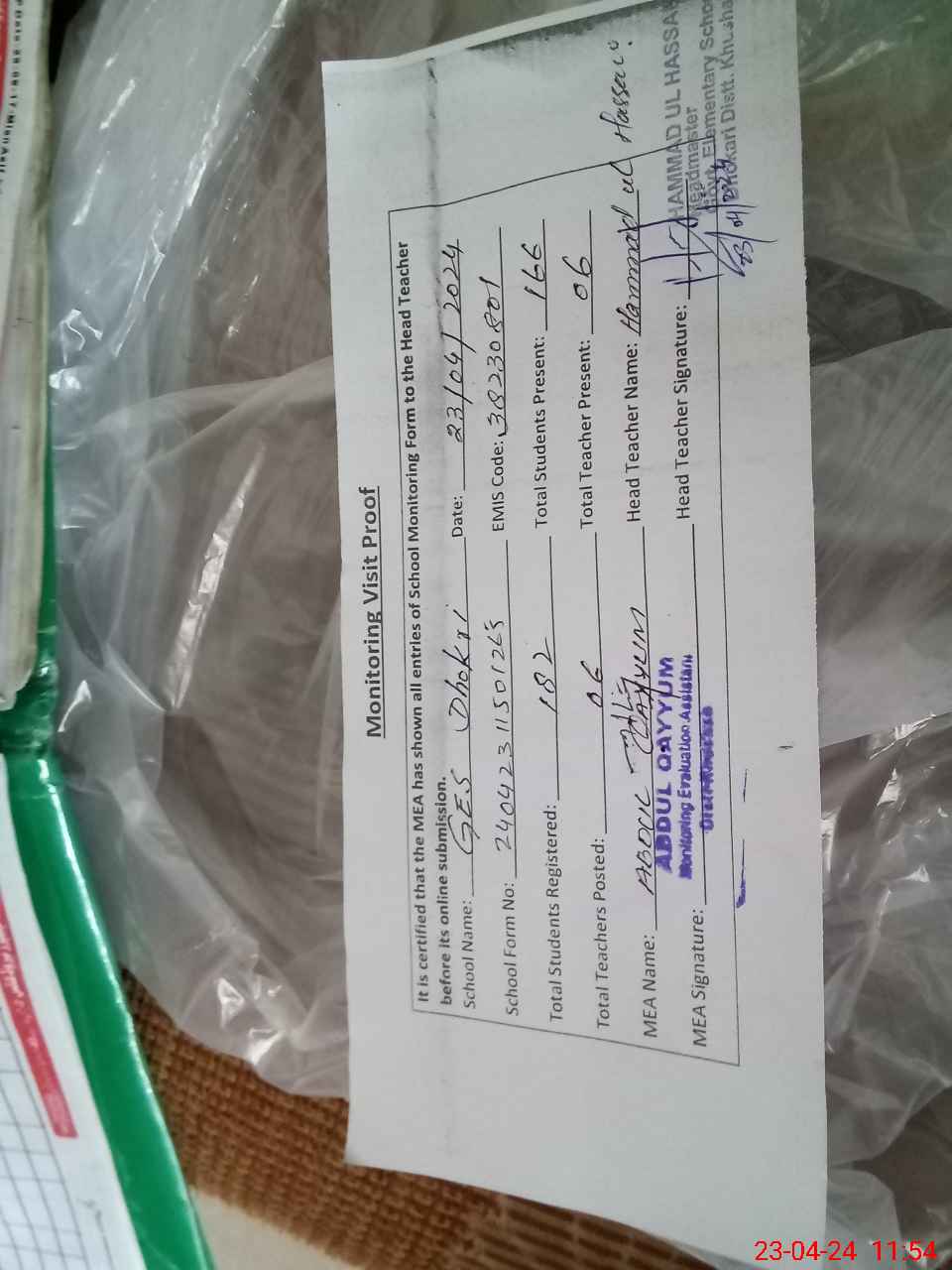 | Attendance Register | Head Teacher | MEA with School | Visit Proof |
