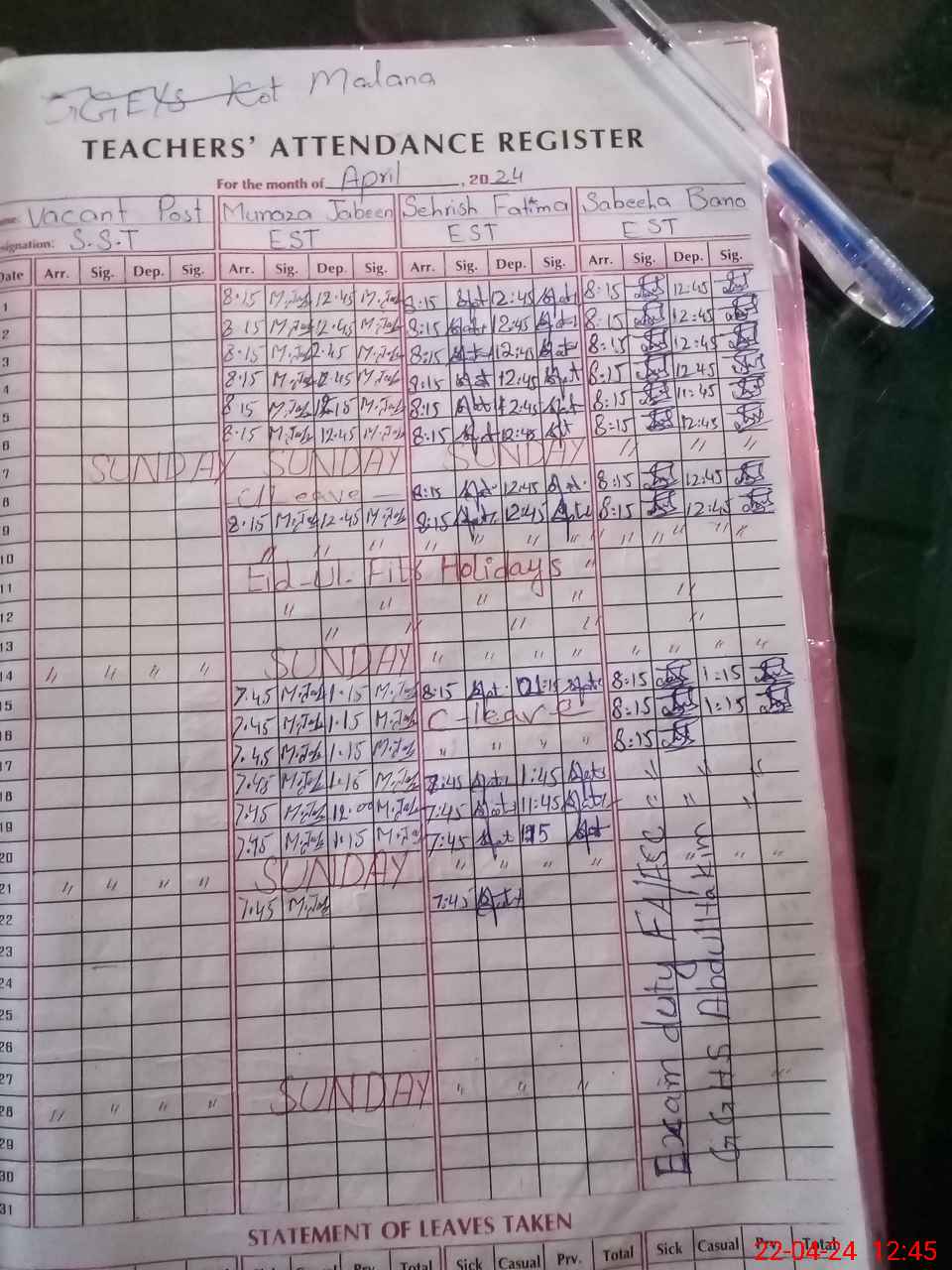 | 36**** | Sa**** Ba**** | 3 | 1 | 0 | 0 | 0 | 0 | 0 | 0 | 0 | 0 | 0 | Exam Duty |