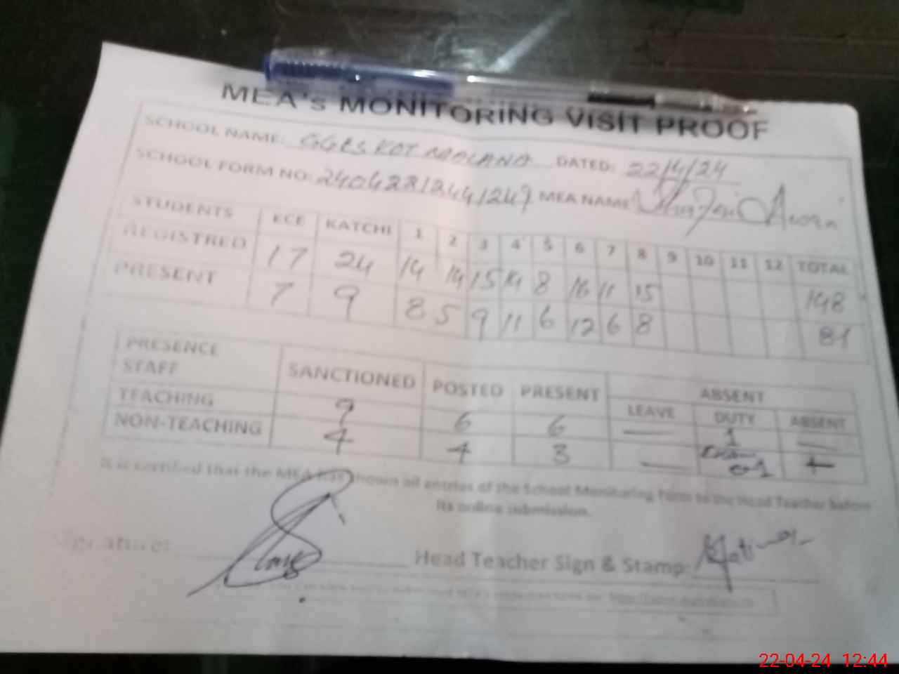 | Attendance Register | Head Teacher | MEA with School | Visit Proof |