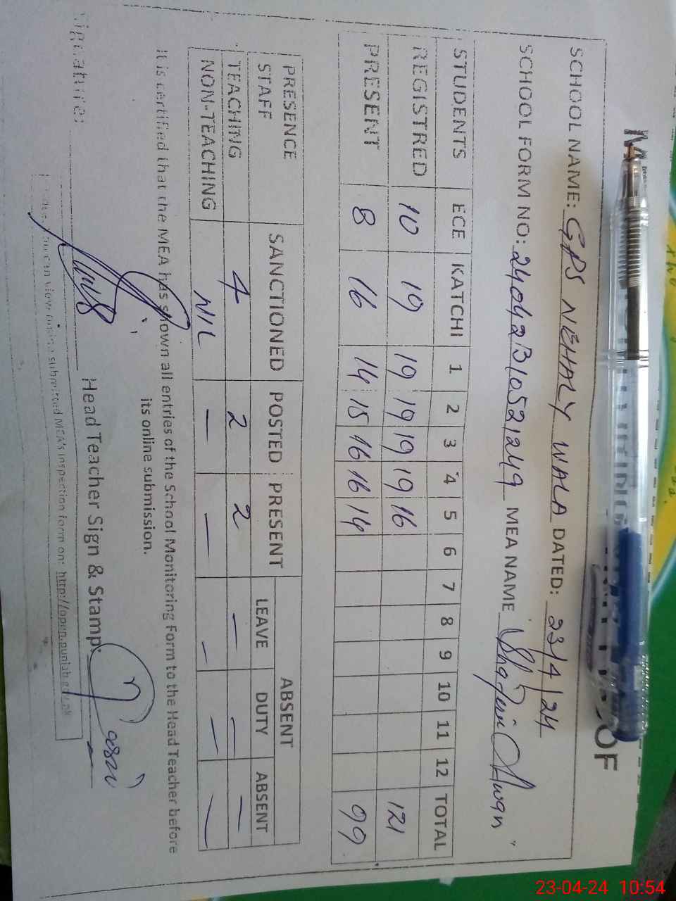 | Attendance Register | Head Teacher | MEA with School | Visit Proof |