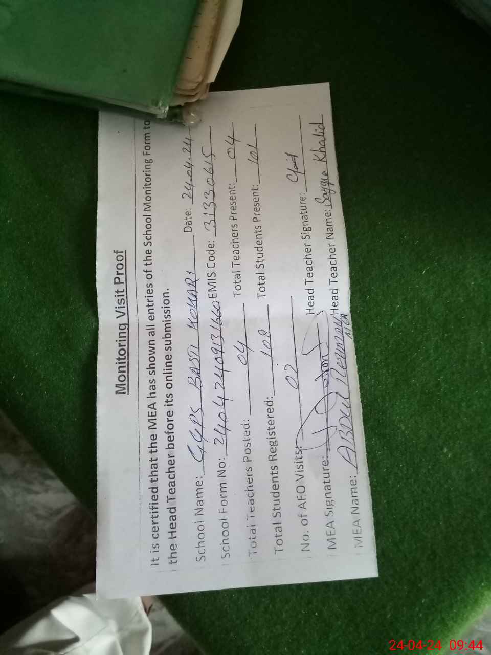 | Attendance Register | Head Teacher | MEA with School | Visit Proof |