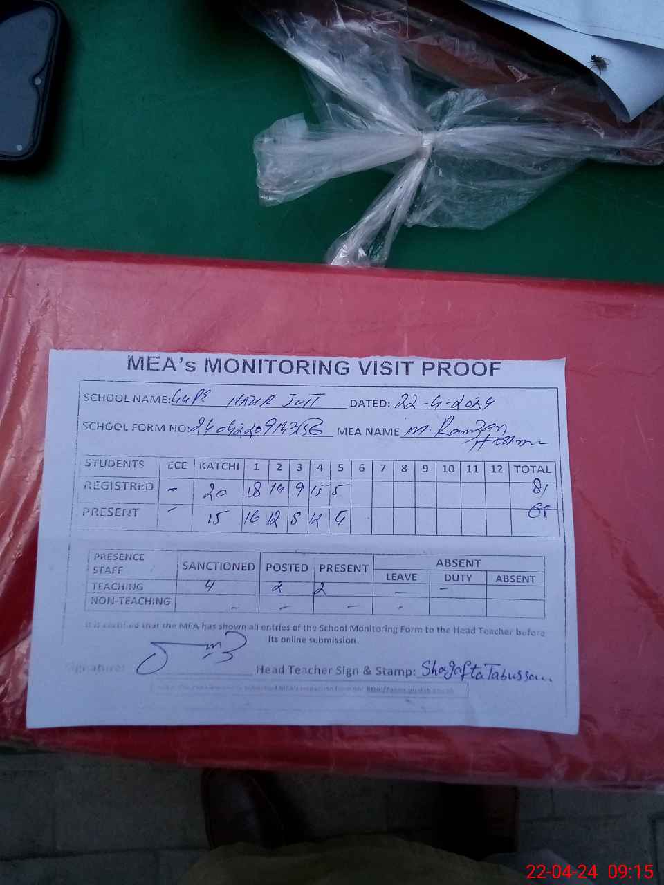 | Attendance Register | Head Teacher | MEA with School | Visit Proof |