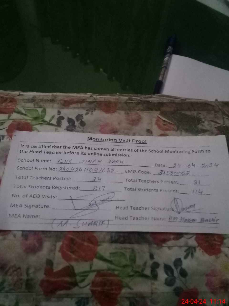 | Attendance Register | Head Teacher | MEA with School | Visit Proof |