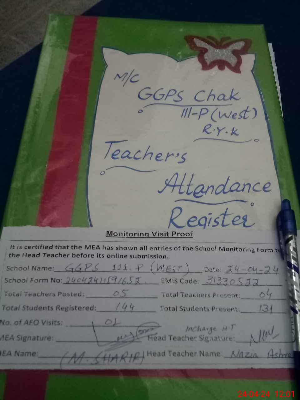 | EMIS Code: 31330522 | Name of School: GGPS MC CHAK NO.111/P GHARBI | |||