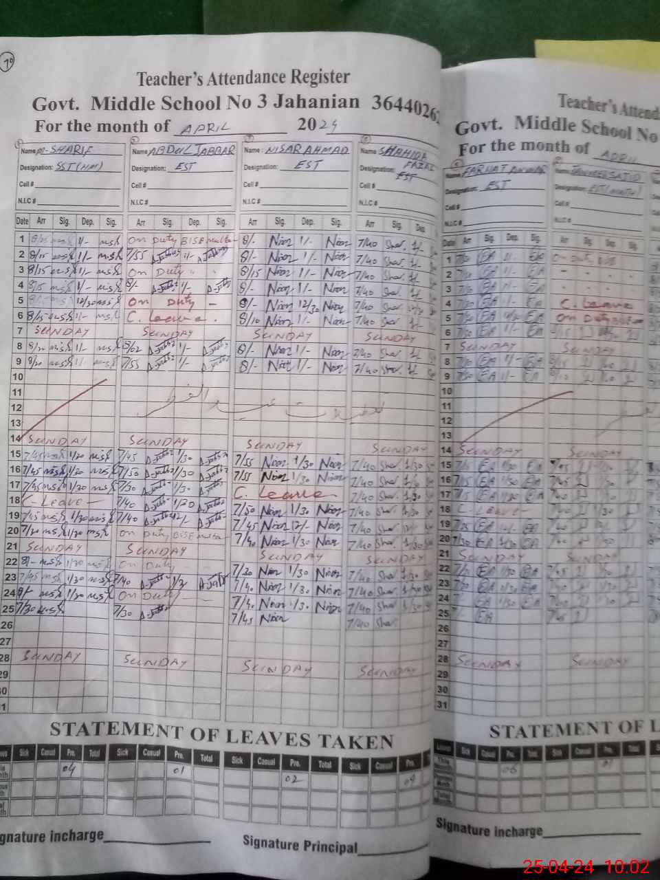 | CNIC | Full Name | Designation | R/C | Absence During Last Calender Month |