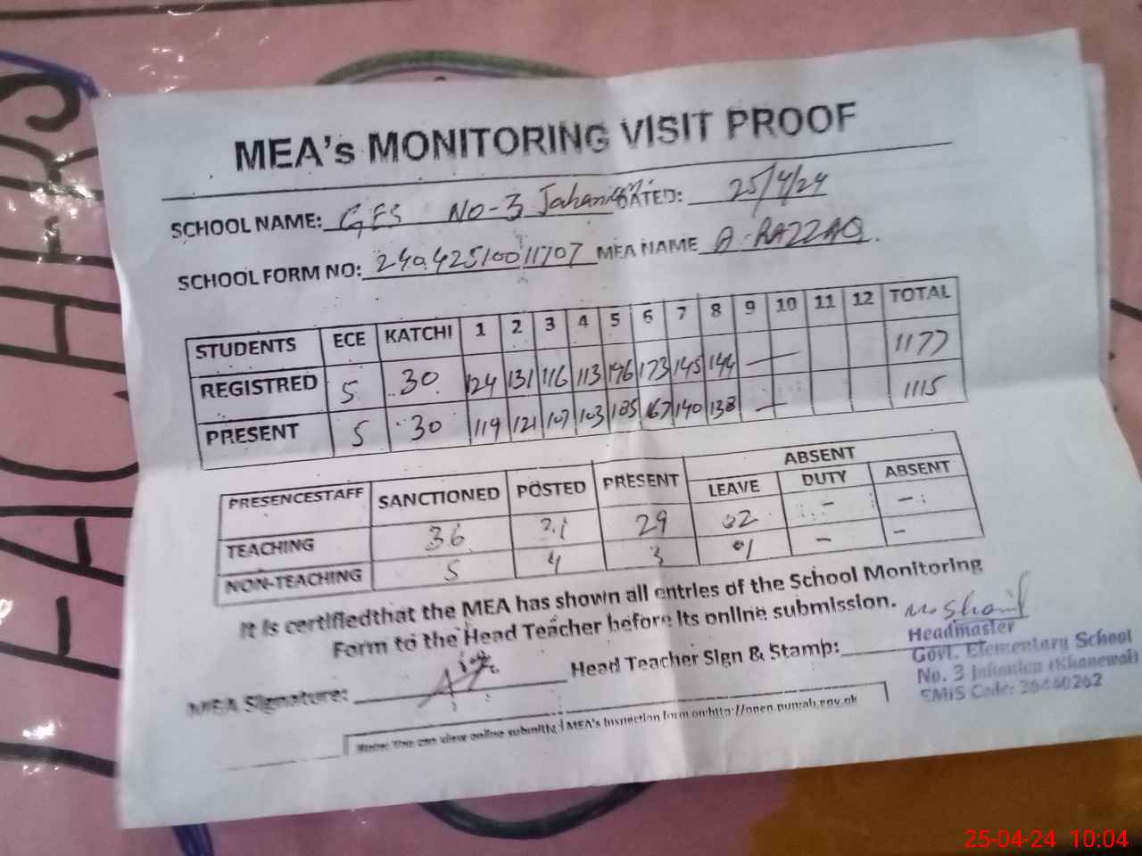 | Attendance Register | Head Teacher | MEA with School | Visit Proof |