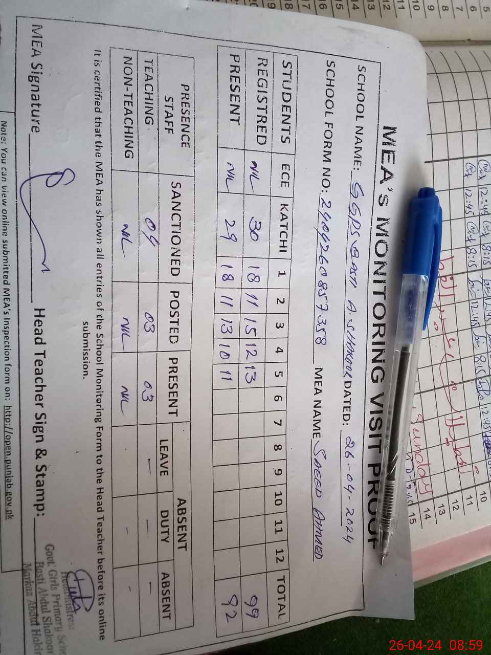 | Attendance Register | Head Teacher | MEA with School | Visit Proof |