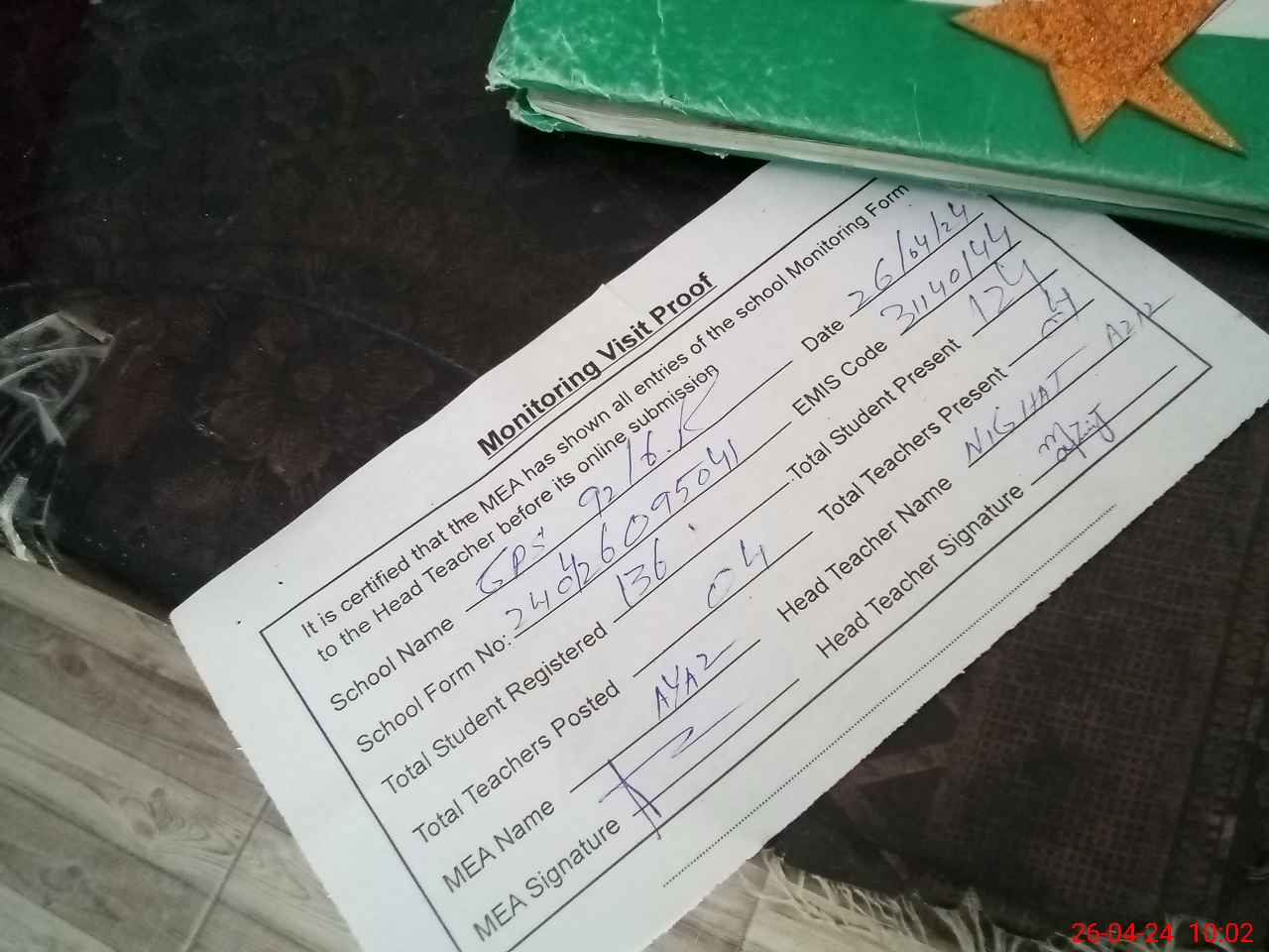 | Attendance Register | Head Teacher | MEA with School | Visit Proof |