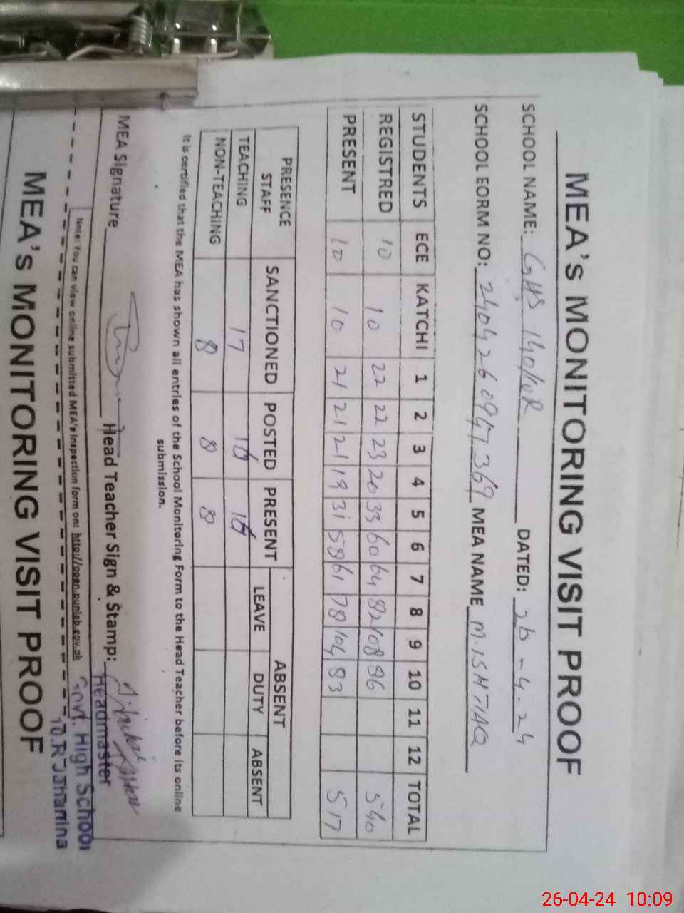 | Certified that this School was Inspected by the Undersigned MEA/DMO Today and the Information Stated Above is as Per Record. | |||||