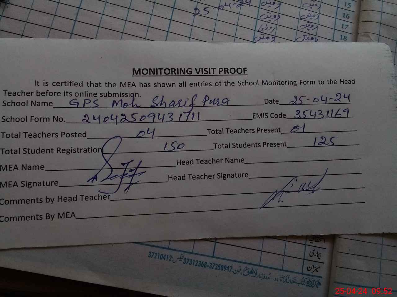 | Attendance Register | Head Teacher | MEA with School | Visit Proof |