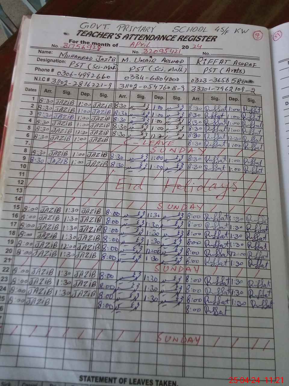| CNIC | Full Name | Designation | R/C | Absence During Last Calender Month |