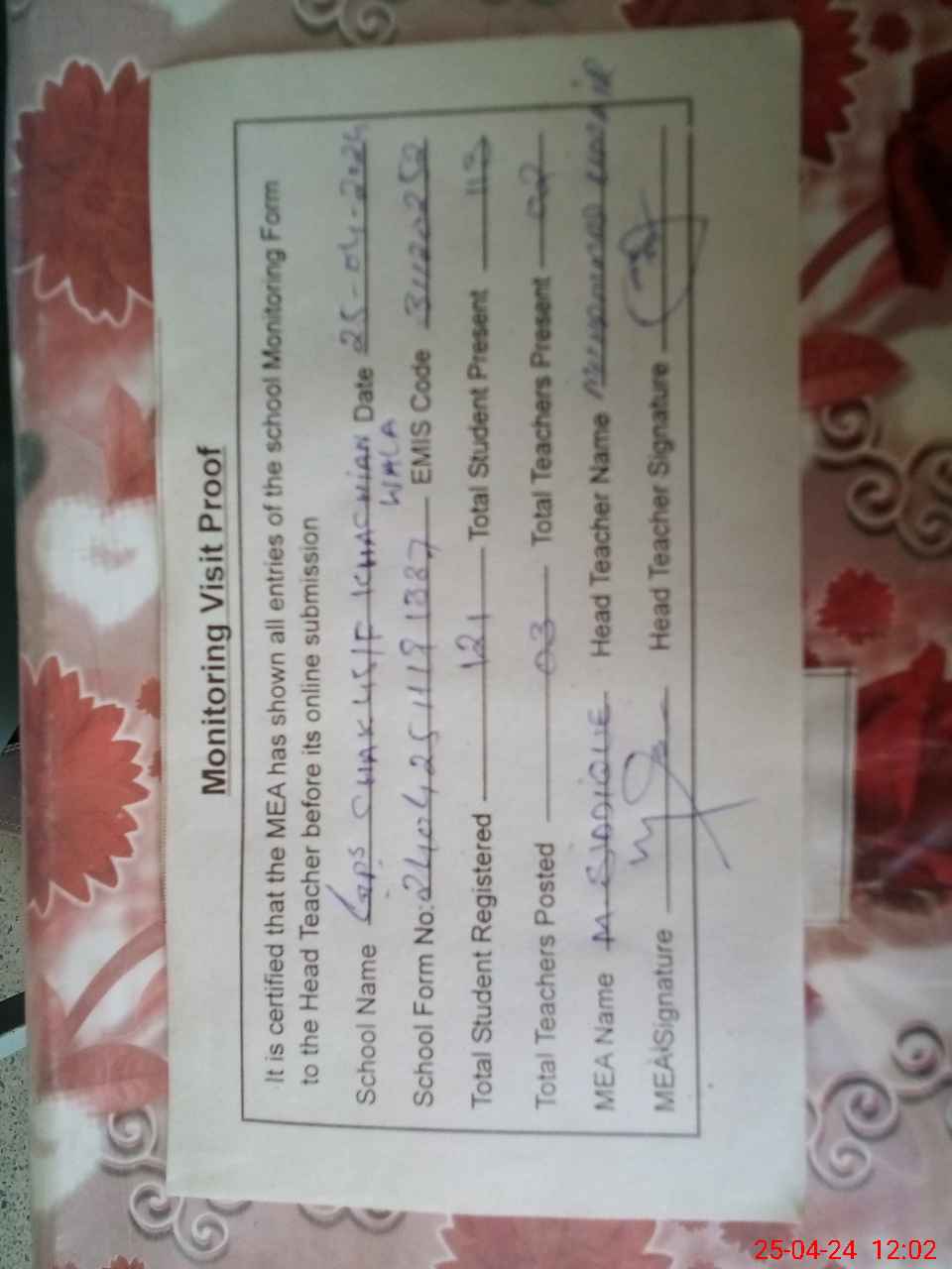 | Attendance Register | Head Teacher | MEA with School | Visit Proof |