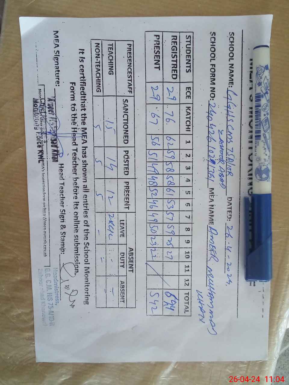 | Attendance Register | Head Teacher | MEA with School | Visit Proof |