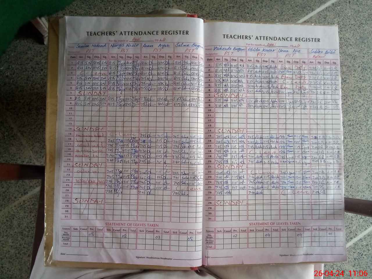 | Leave | Duty | Absent | Maternity | Medical | Ex- Pak |