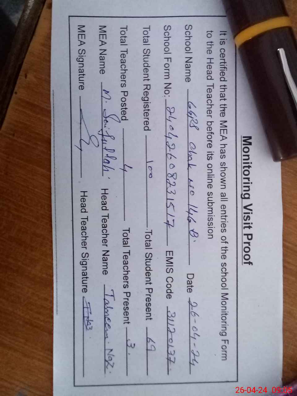 | Certified that this School was Inspected by the Undersigned MEA/DMO Today and the Information Stated Above is as Per Record. | |||||