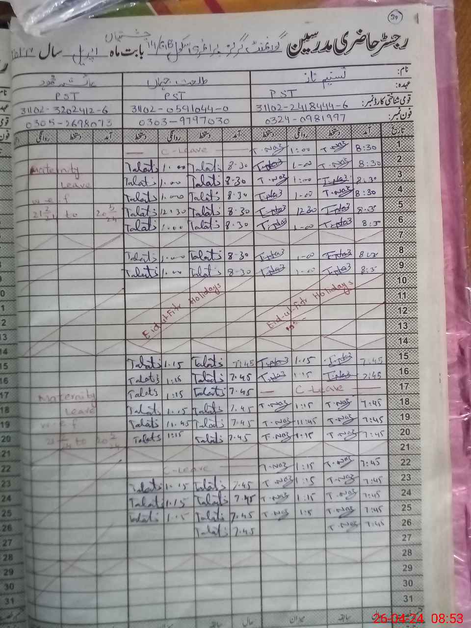 | 31**** | Ay**** Me**** | PST | Regular | 31 | 0 | 0 | 31 | 0 | 0 | 0 | 0 | 0 | Maternity |