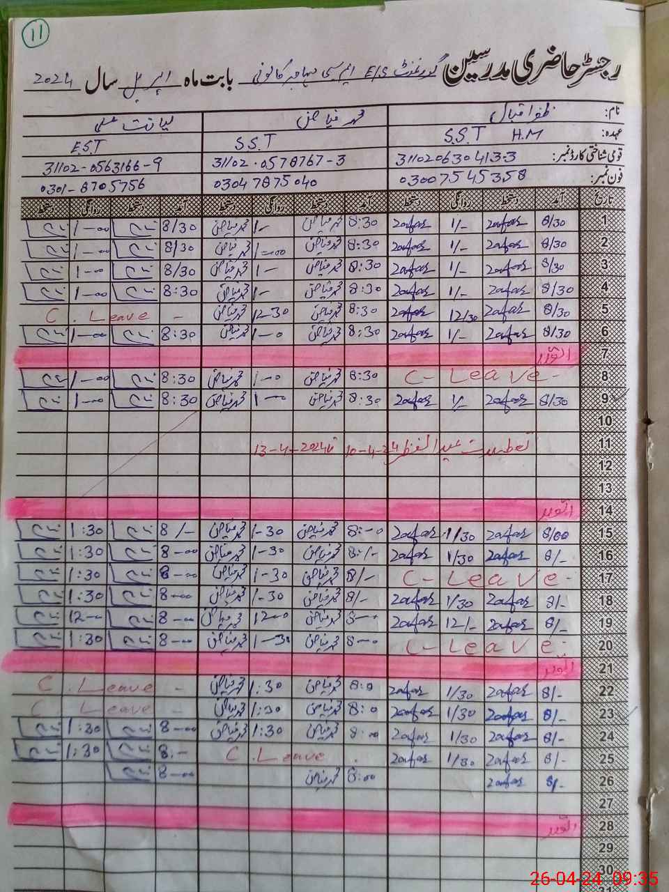 | CNIC | Full Name | Designation | R/C | Absence During Last Calender Month |