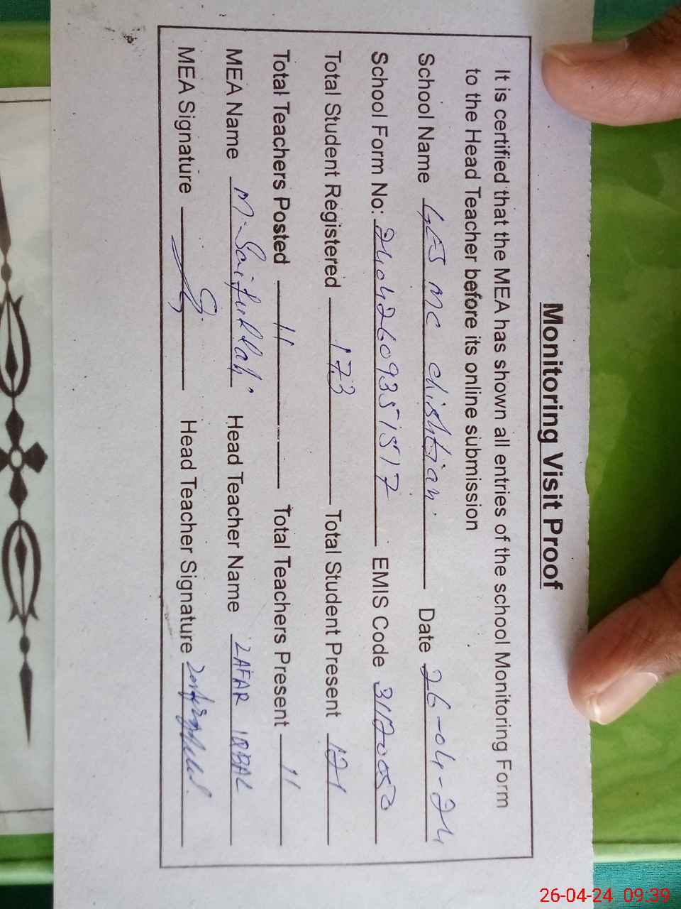 | Attendance Register | Head Teacher | MEA with School | Visit Proof |