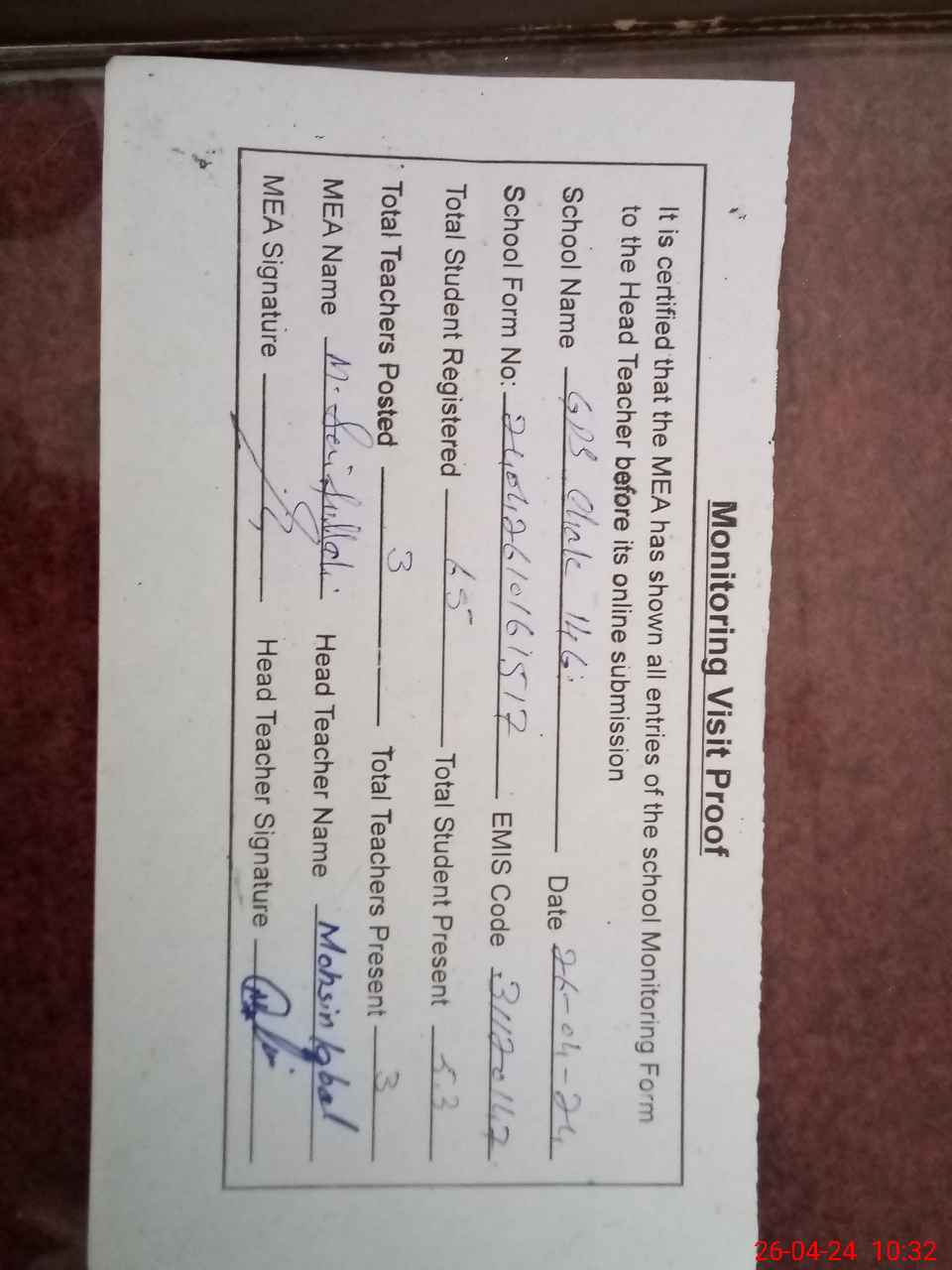 | Attendance Register | Head Teacher | MEA with School | Visit Proof |