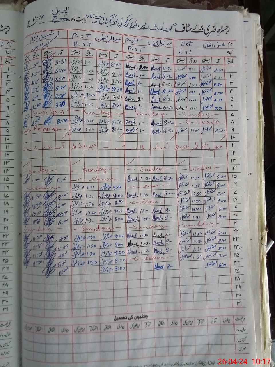 | CNIC | Full Name | Designation | R/C | Absence During Last Calender Month |