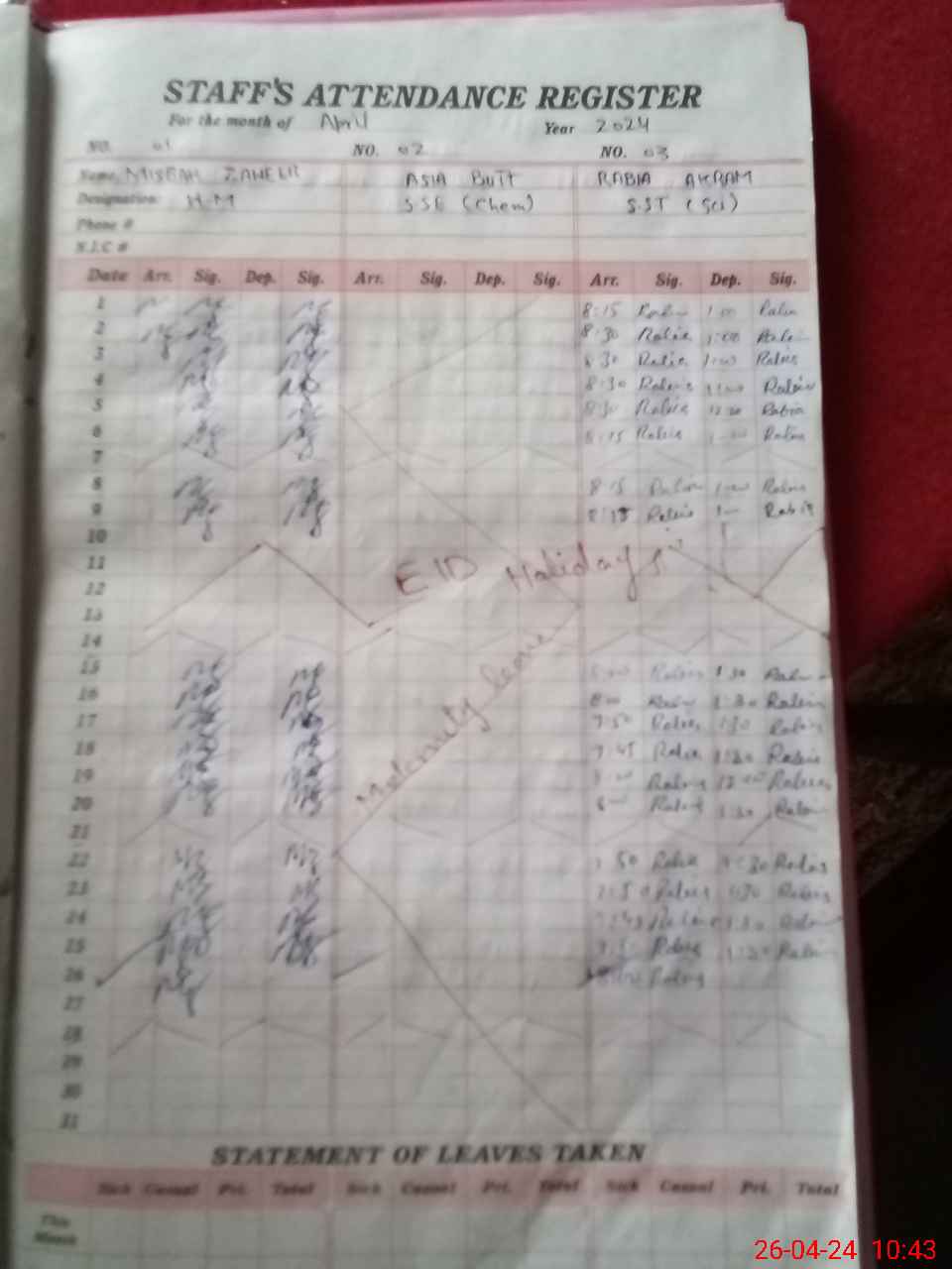 | Leave | Duty | Absent | Maternity | Medical | Ex- Pak |