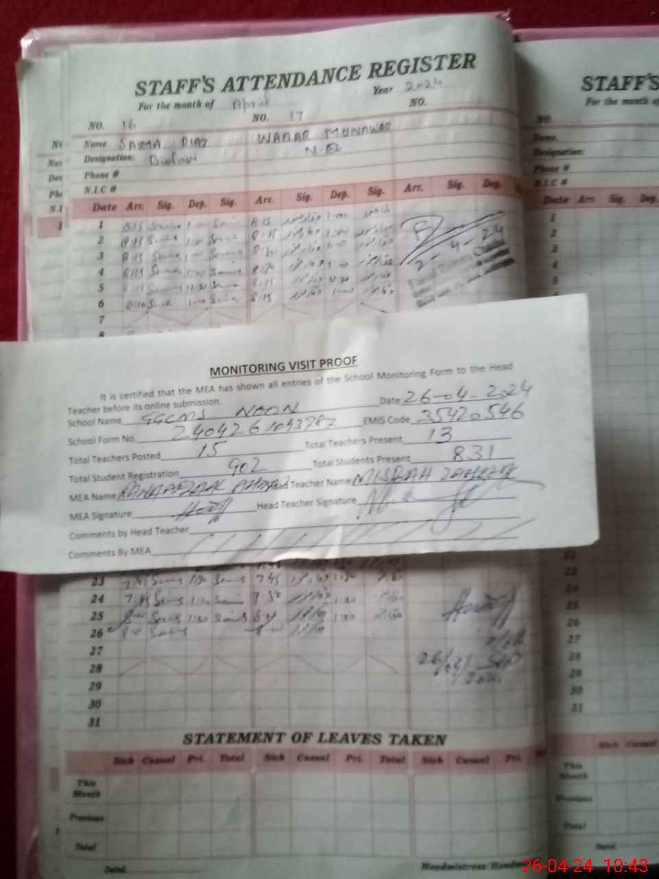 | Attendance Register | Head Teacher | MEA with School | Visit Proof |