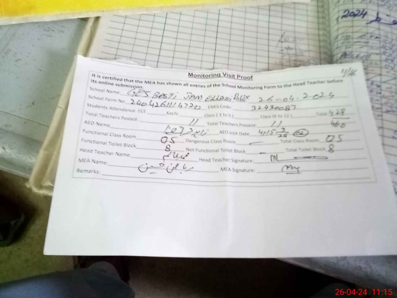 | Attendance Register | Head Teacher | MEA with School | Visit Proof |
