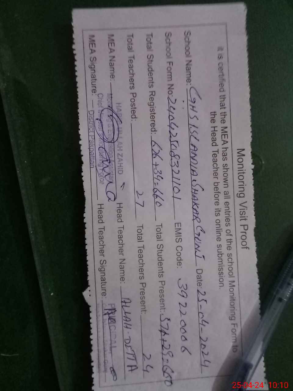 | Attendance Register | Head Teacher | MEA with School | Visit Proof |