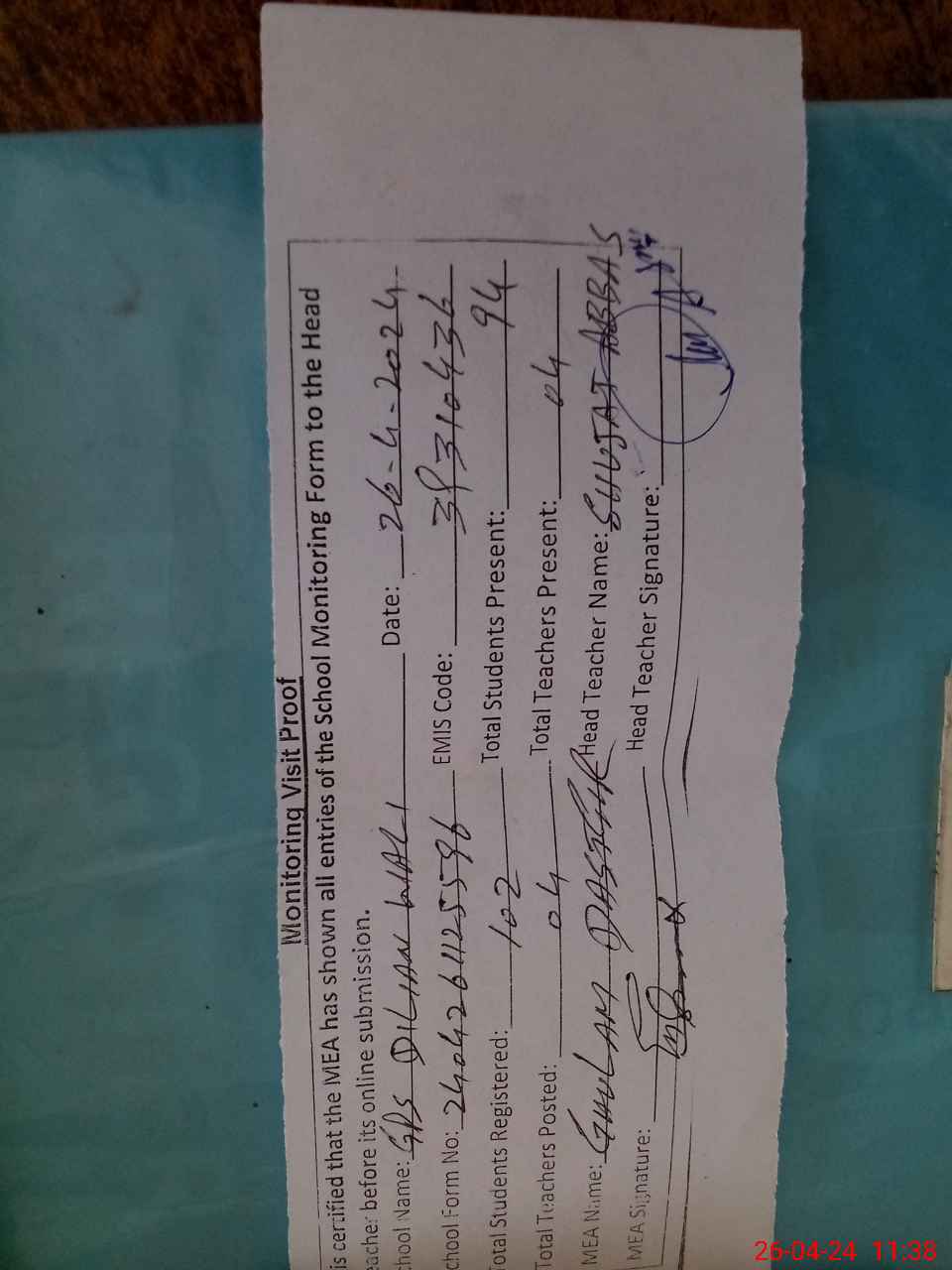 | Attendance Register | Head Teacher | MEA with School | Visit Proof |