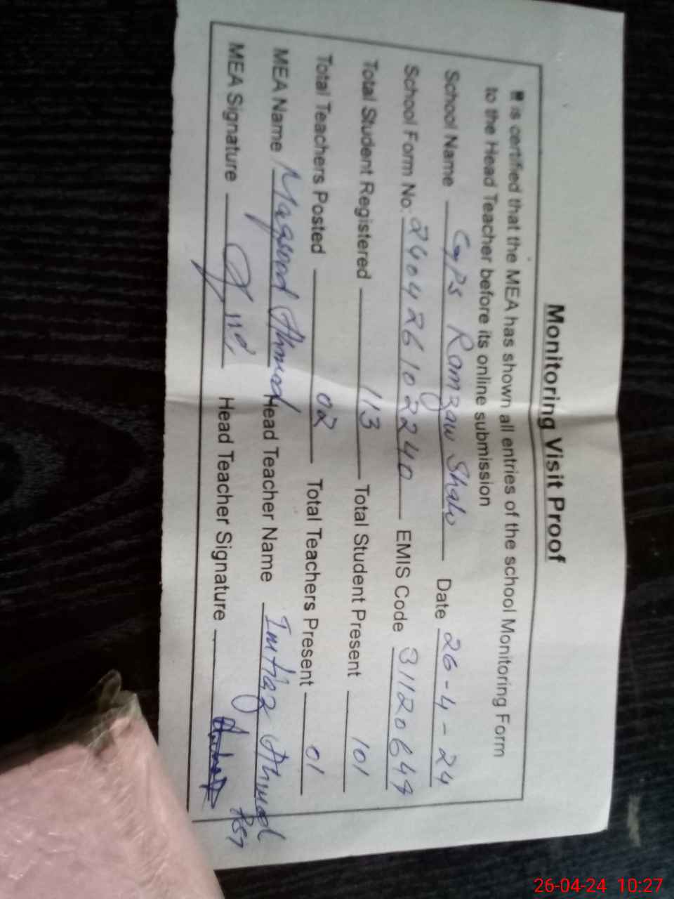 | Attendance Register | Head Teacher | MEA with School | Visit Proof |