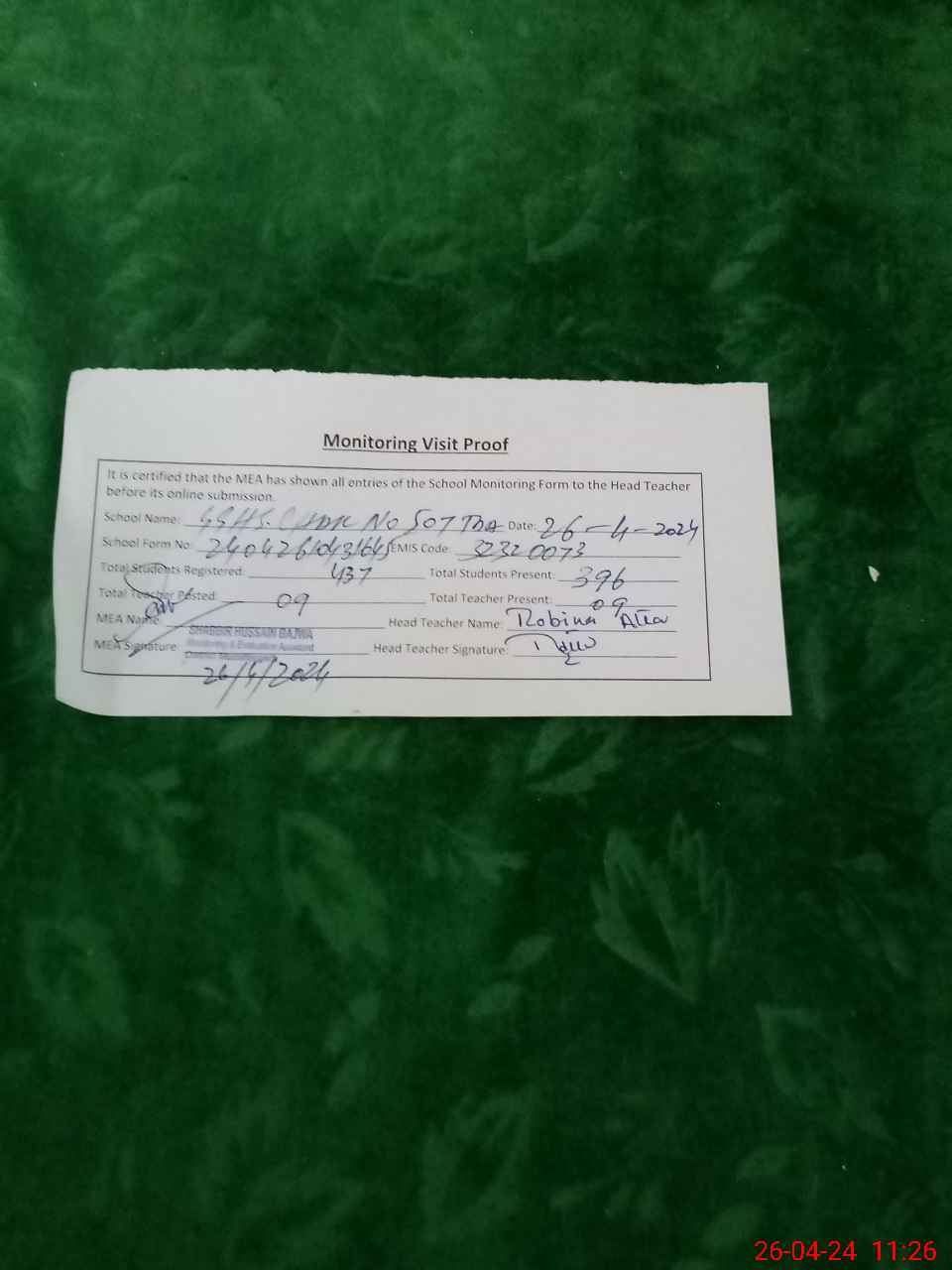 | Attendance Register | Head Teacher | MEA with School | Visit Proof |