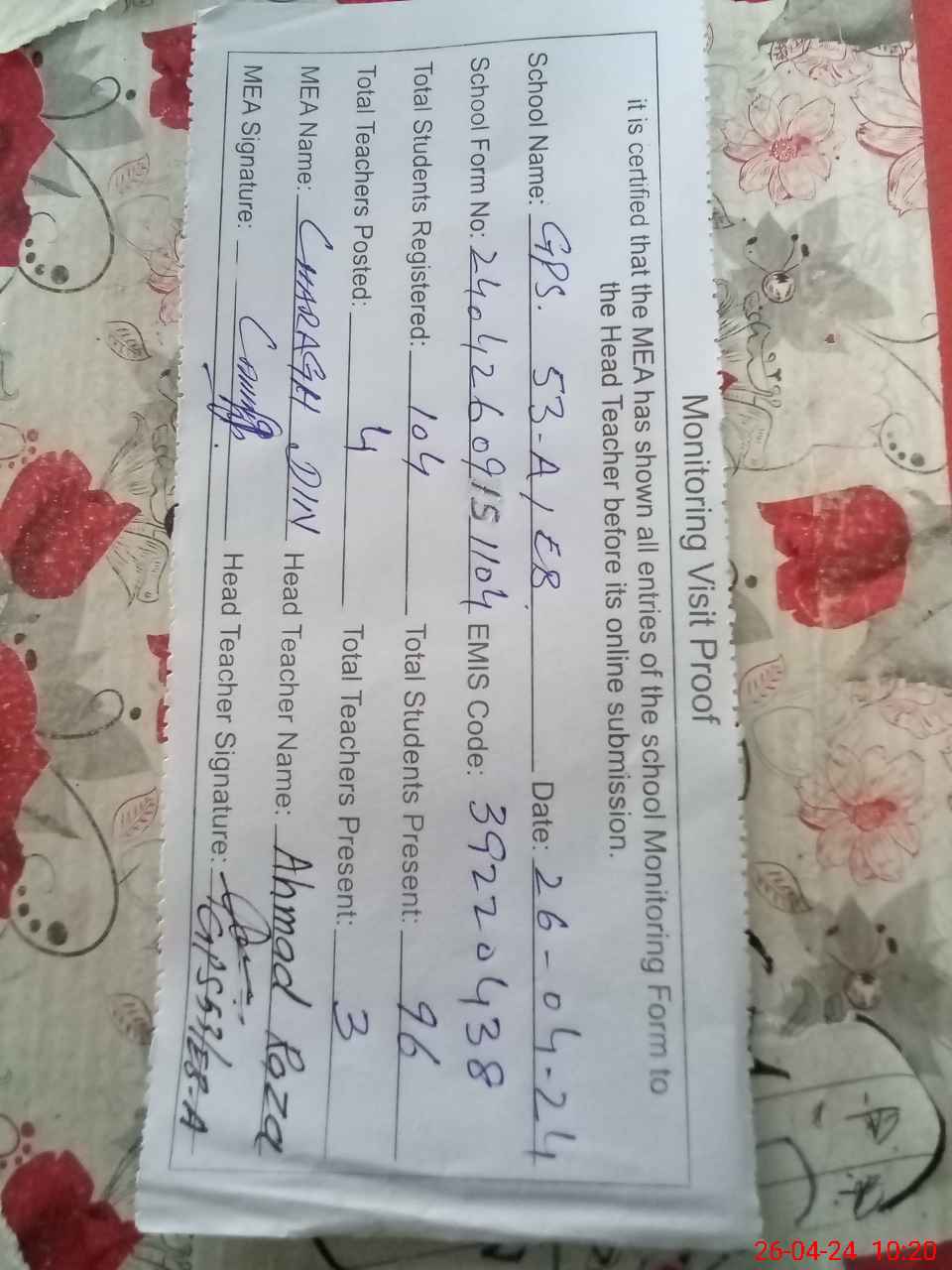| EMIS Code: 39220438 | Name of School: GPS CHAK NO. 53 EB A | |||