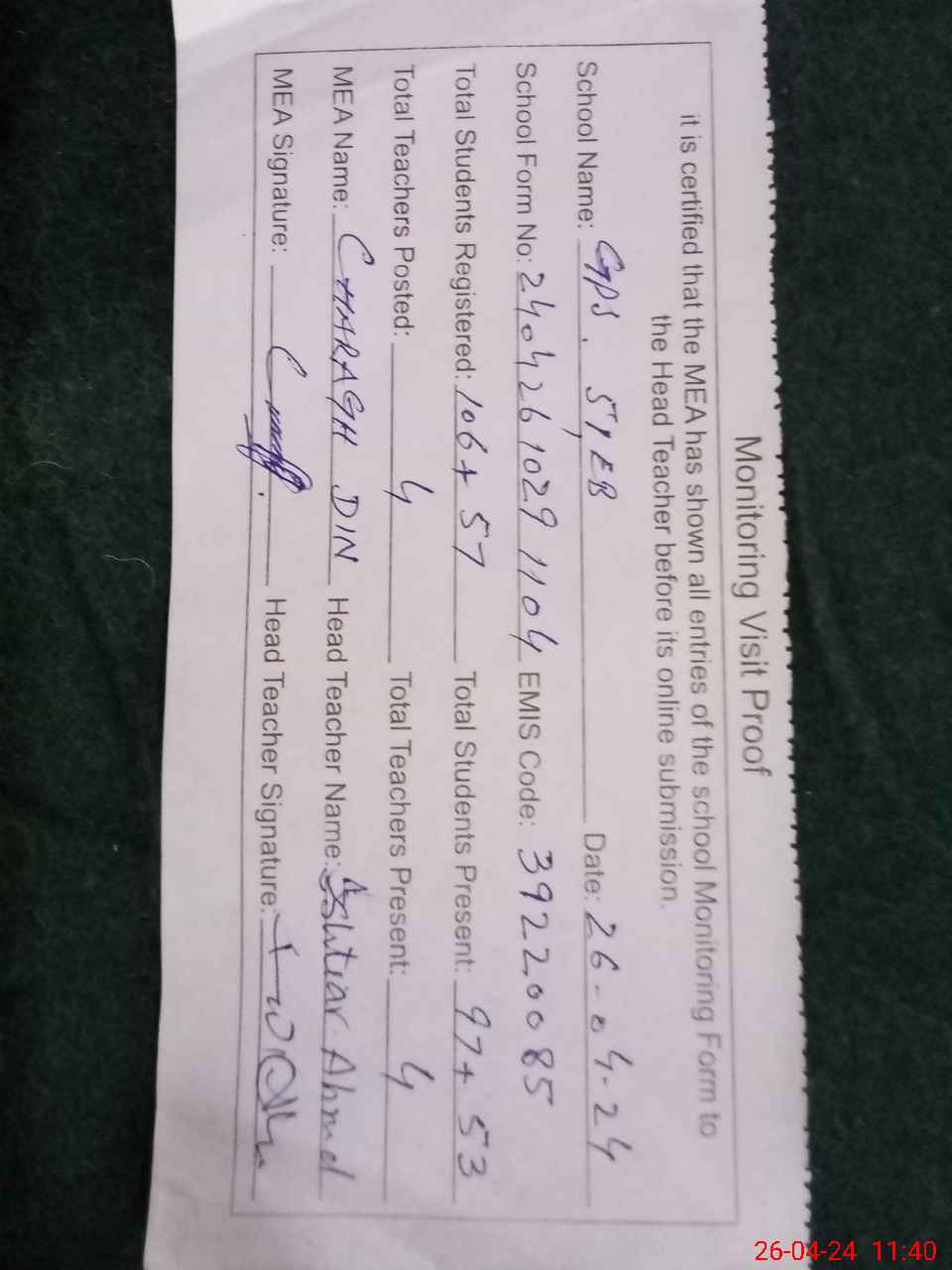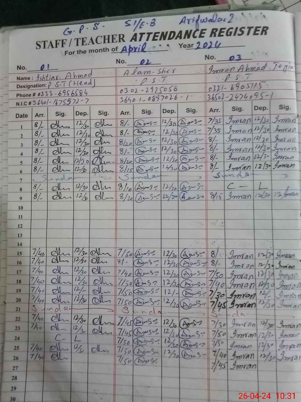 | Name: IS**** AH**** Designation: (School Headmaster's/Headmistress's) PST Phone/Cell Number: 03**** |