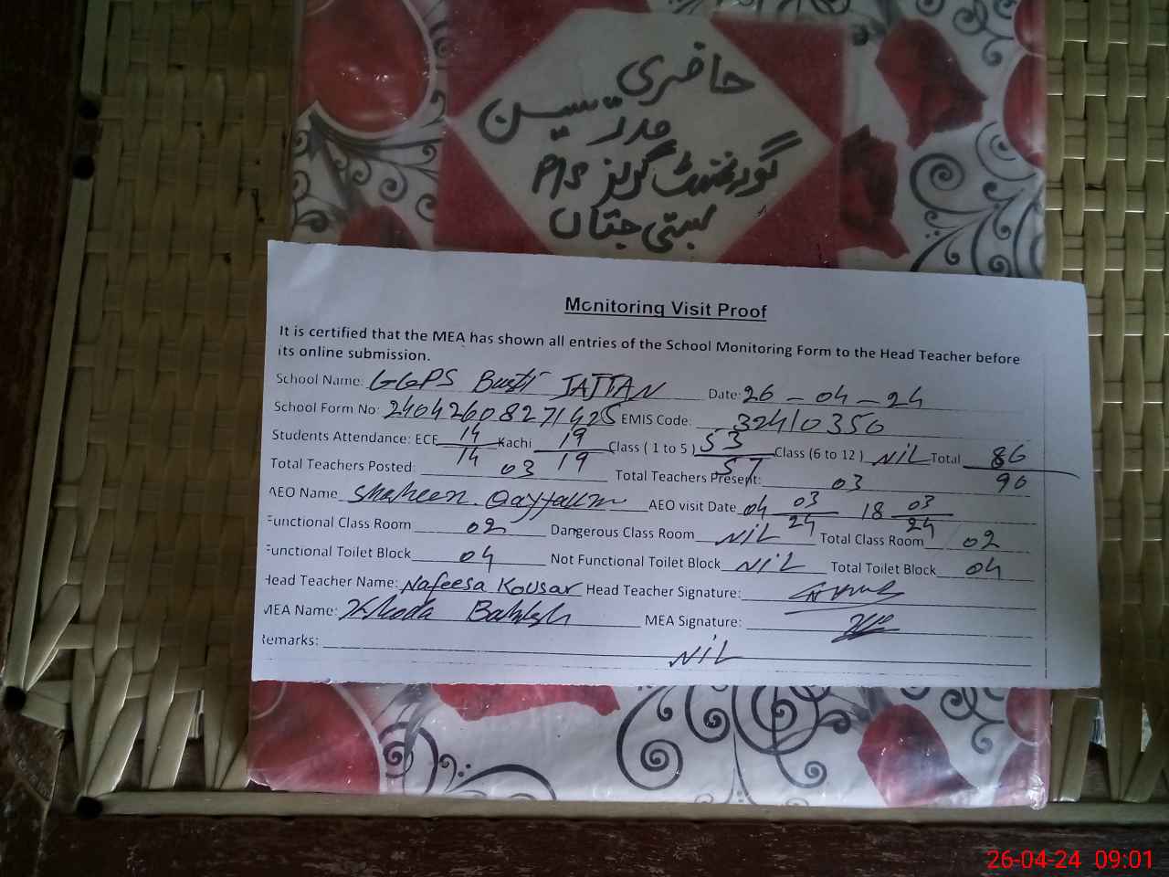 | Certified that this School was Inspected by the Undersigned MEA/DMO Today and the Information Stated Above is as Per Record. | |||||