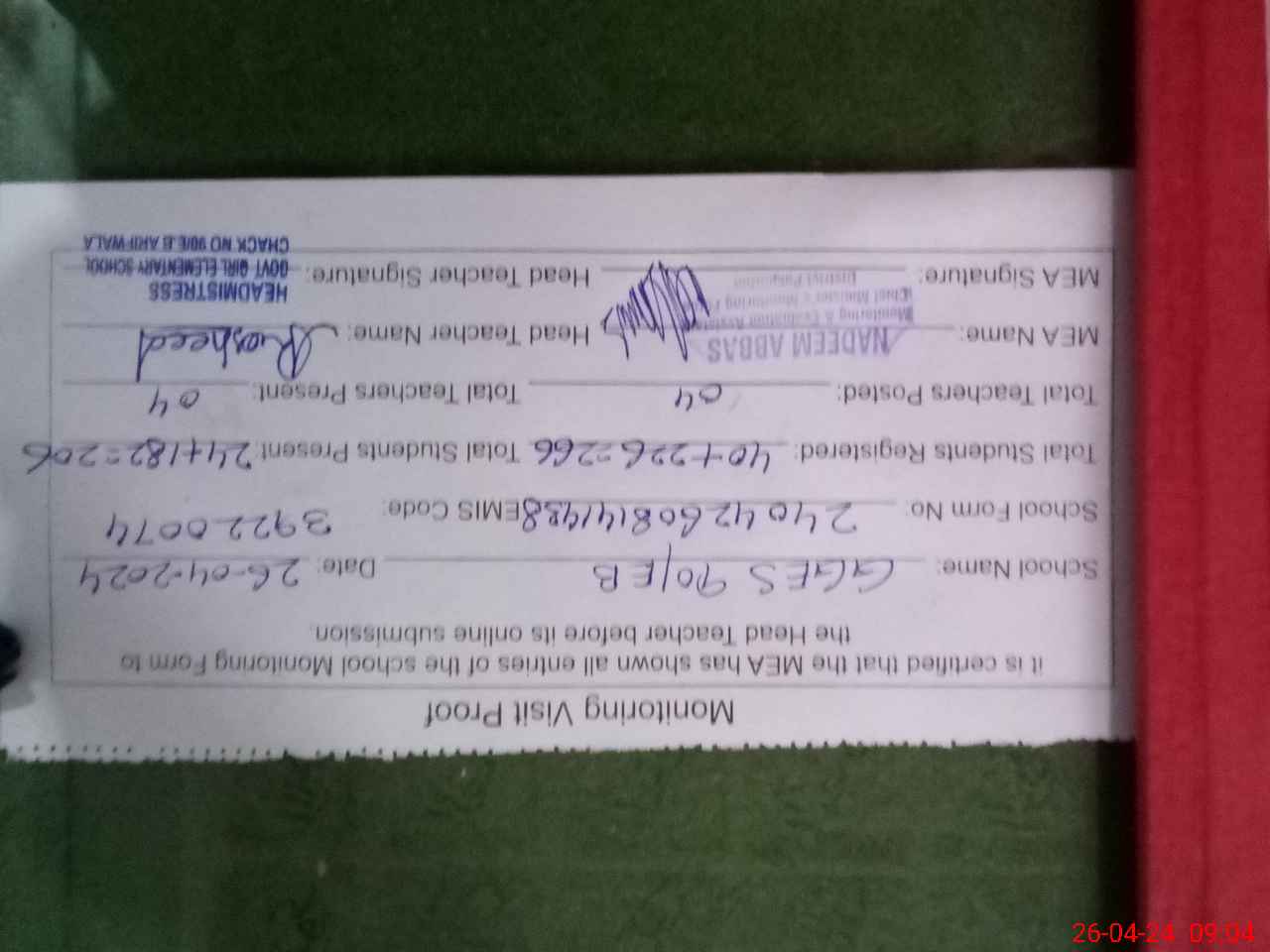 | Certified that this School was Inspected by the Undersigned MEA/DMO Today and the Information Stated Above is as Per Record. | |||||