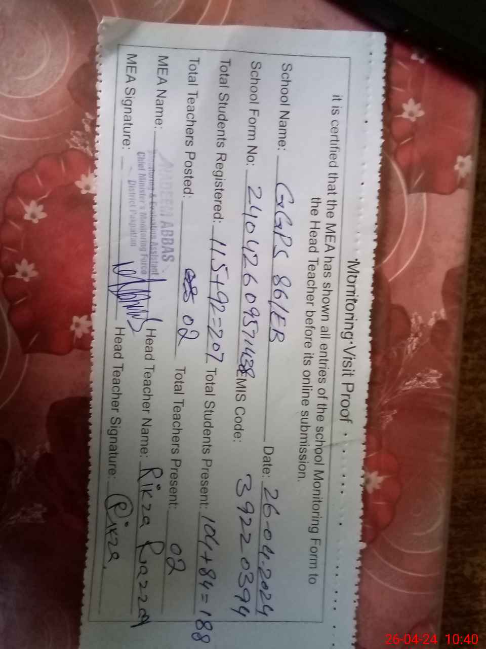 | Certified that this School was Inspected by the Undersigned MEA/DMO Today and the Information Stated Above is as Per Record. | |||||