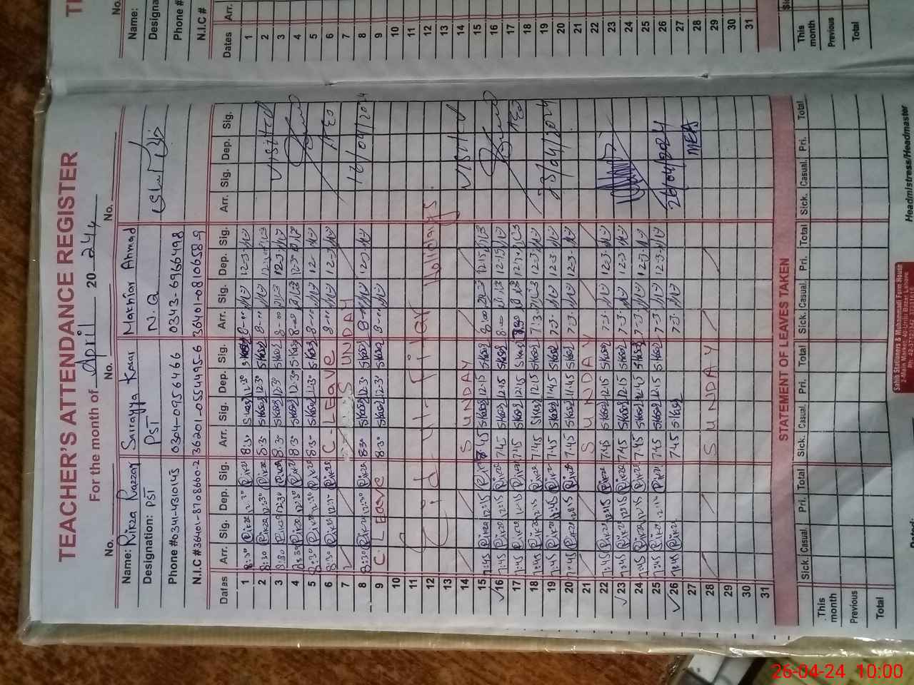 | Name: RI**** RA**** Designation: (School Headmaster's/Headmistress's) PST Phone/Cell Number: 03**** |