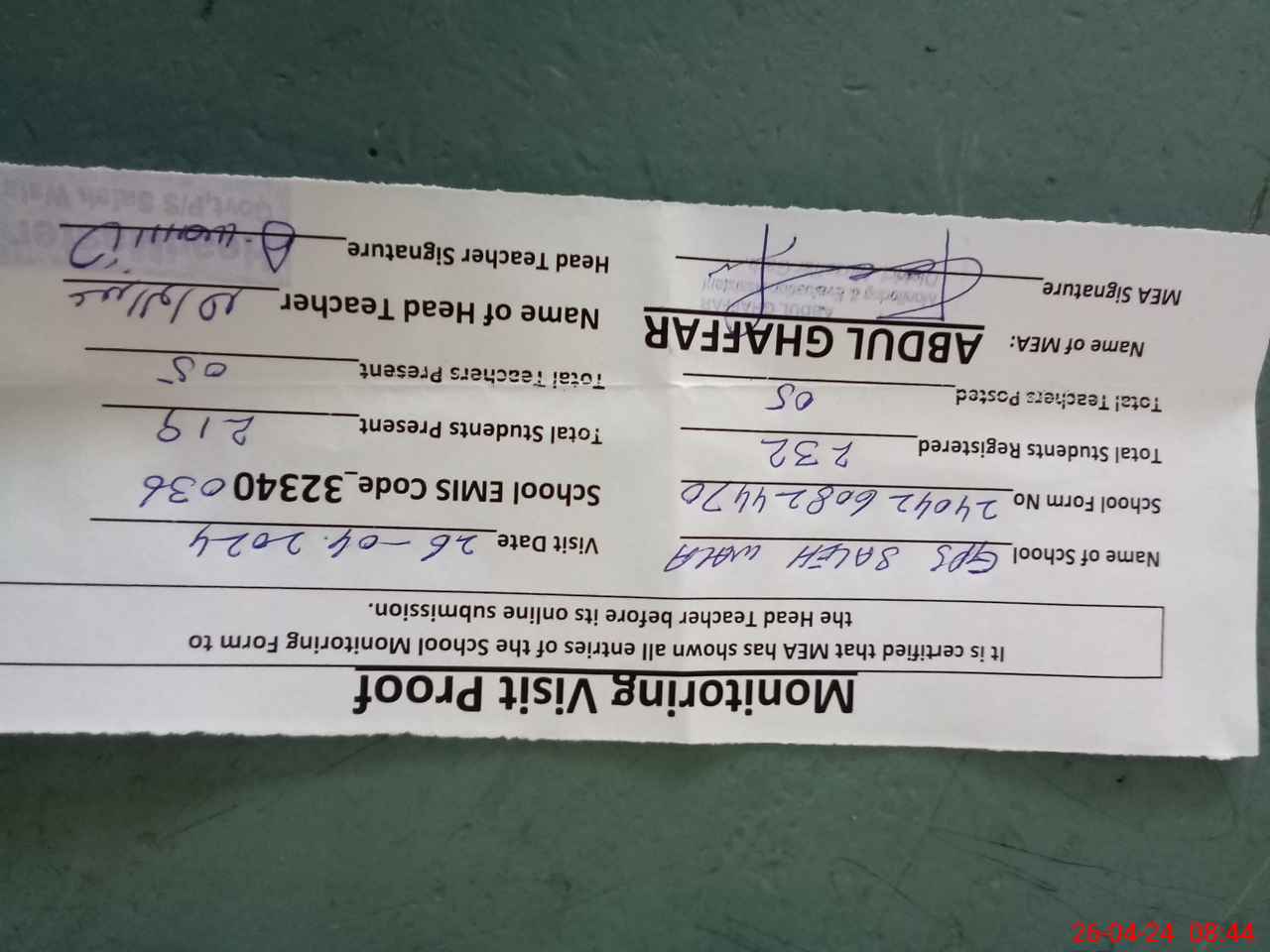 | EMIS Code: 32340036 | Name of School: GPS SALEH WALA | |||