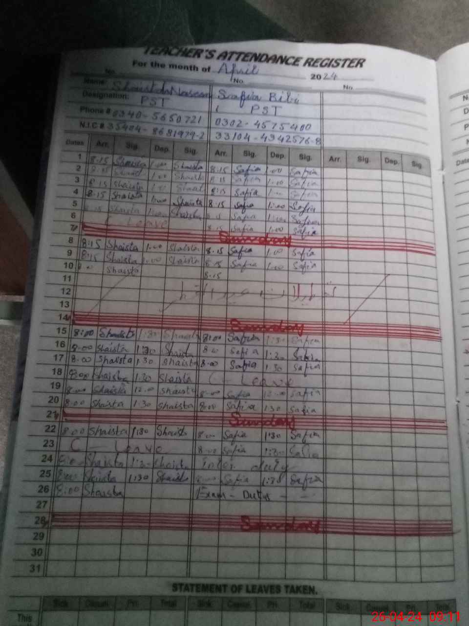 | 33**** | Sa**** Bi**** | PST | Regular | 0 | 0 | 0 | 0 | 0 | 0 | 0 | 0 | 0 | Exam Duty |