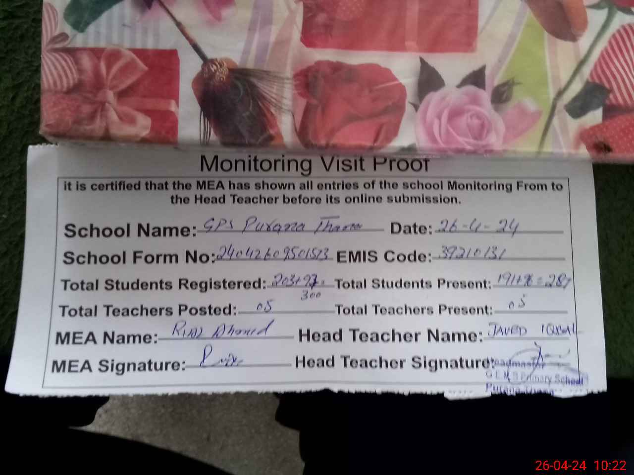 | Attendance Register | Head Teacher | MEA with School | Visit Proof |