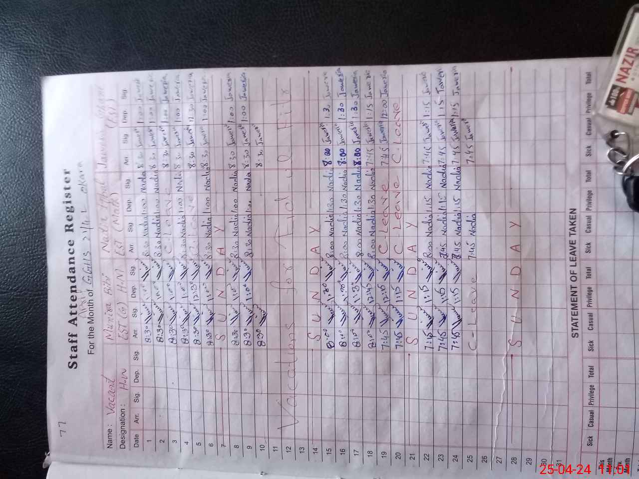 | Leave | Duty | Absent | Maternity | Medical | Ex- Pak |
