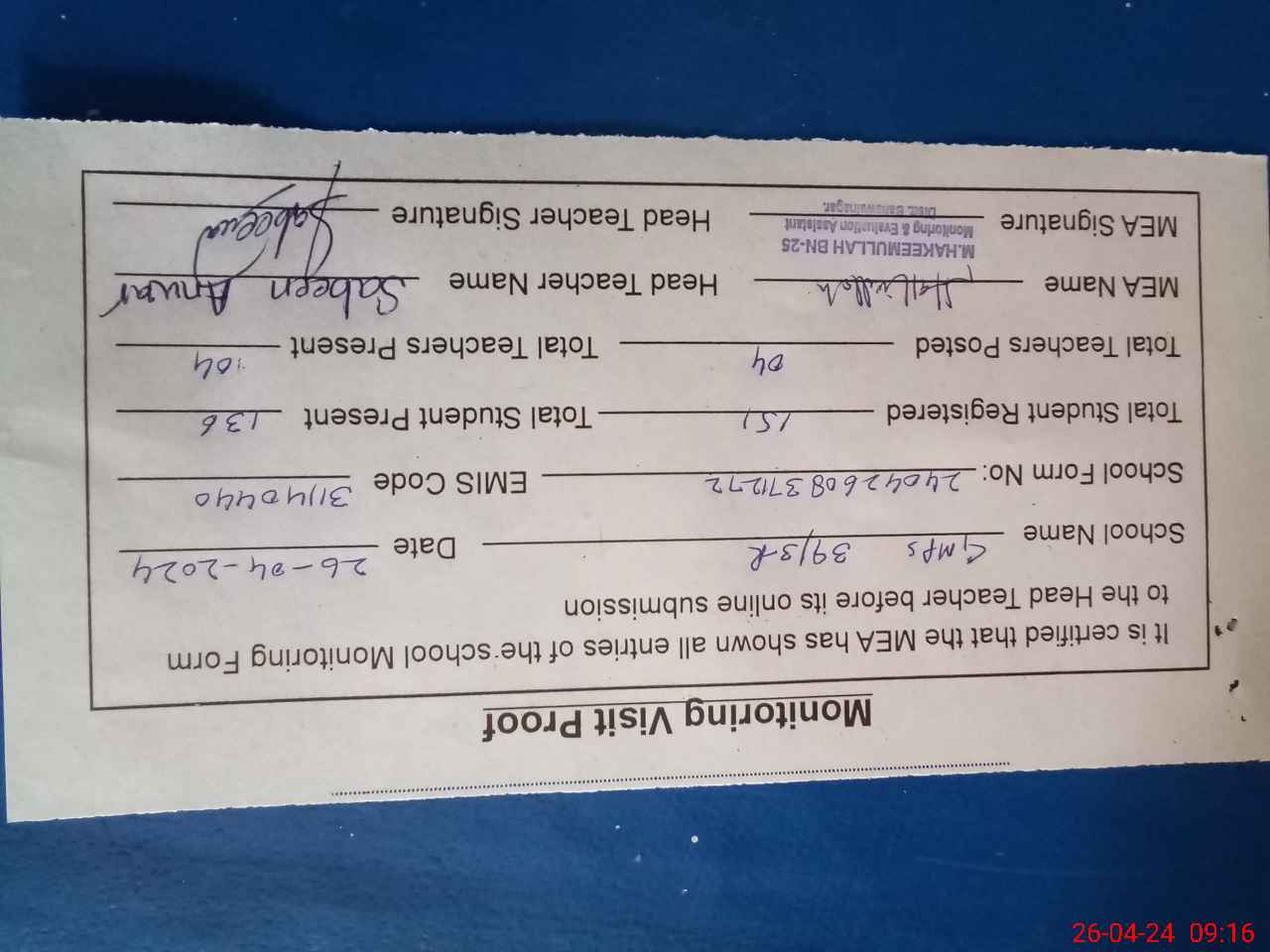 | Attendance Register | Head Teacher | MEA with School | Visit Proof |