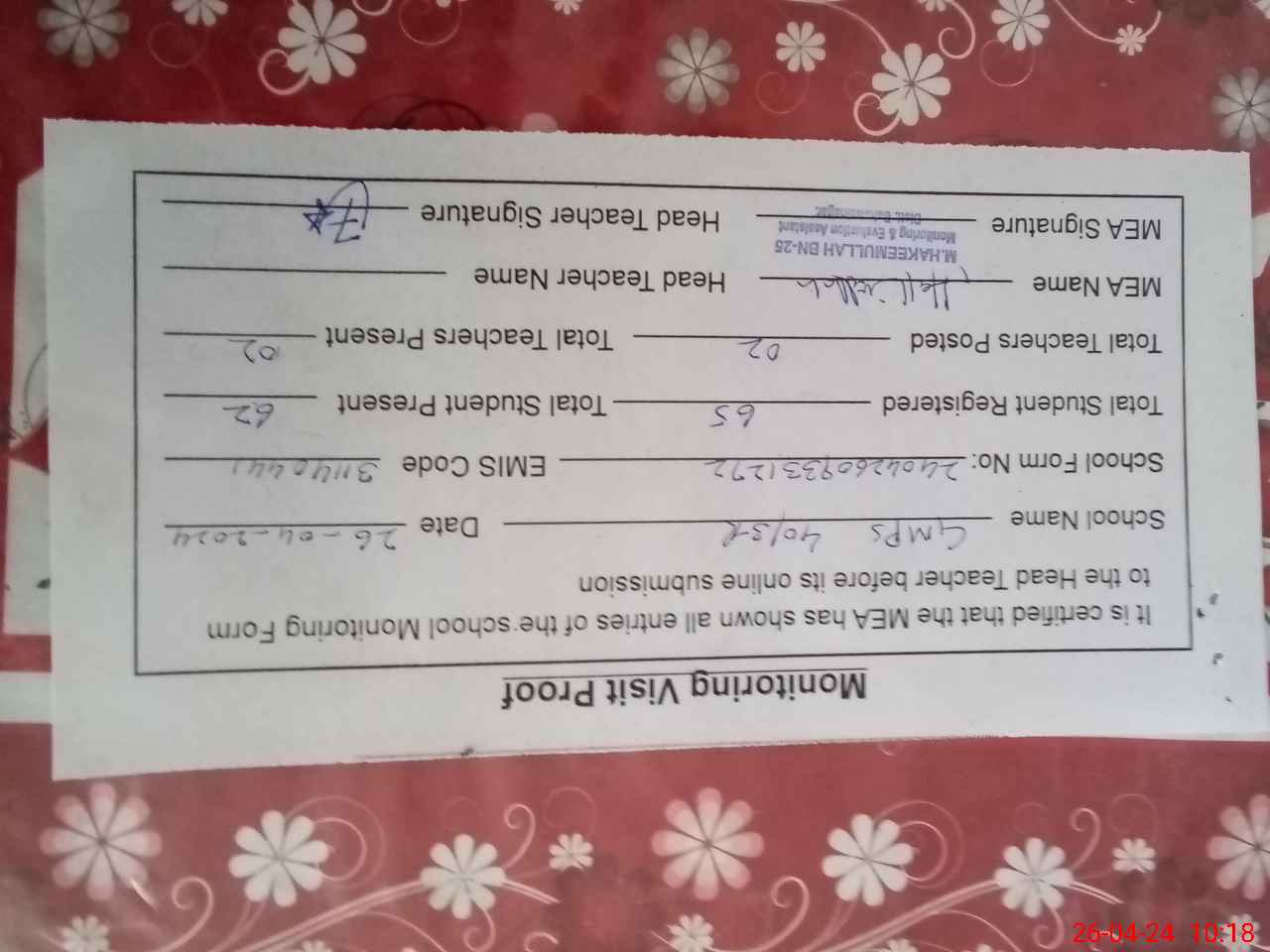 | Certified that this School was Inspected by the Undersigned MEA/DMO Today and the Information Stated Above is as Per Record. | |||||
