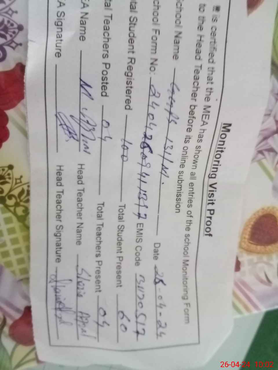 | Attendance Register | Head Teacher | MEA with School | Visit Proof |